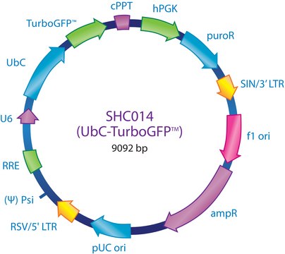 When conducting experiments using MISSION shRNA clones, the proper controls should be a key element of your experimental design to allow for accurate interpretation of knockdown results. Silencing of the CMV promoter can be a problem in some cell types. For these cells, the ubiquitin promoter (UbC) can be a viable alternative. The MISSION UbC-TurboGFP Control Transduction Particles are a positive control to monitor transduction efficiency for applications in which an alternate promoter is necessary. The MISSION UbC-TurboGFP Control Transduction Particles are produced from the sequence-verified 9092 base pair lentivirus plasmid, pLKO.1-puro-UbC-TurboGFP (SHC014).