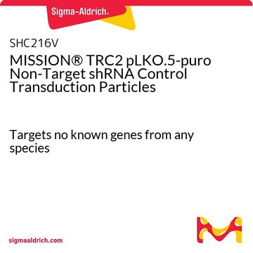 The MISSION® TRC2 pLKO.5-puro Non-Target shRNA Control Tranduction Particles contain an shRNA insert that does not target any known genes from any species, making it useful as a negative control in experiments using the MISSION® shRNA library clones. This allows one to examine the effect of transduction of a short-hairpin on gene expression and interpret the knockdown effect seen with shRNA clones. Ampicillin and puromycin antibiotic resistance genes provide selection in bacterial or mammalian cells respectively. In addition, self-inactivating replication incompetent viral particles can be produced in packaging cells (HEK293T) by co-transfection with compatible packaging plasmids. The Non-Target shRNA Control Transduction Particles are provided as 200 uL at 1 x 106 TU/mL via p24 assay.