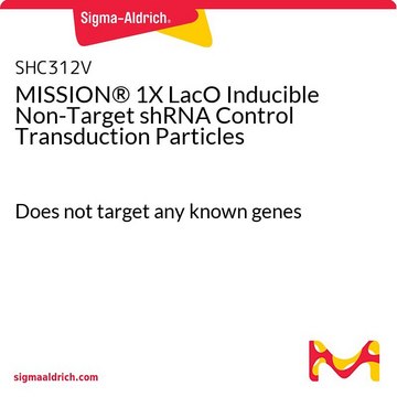 The MISSION 1x LacO Inducible Non-Target shRNA Control Transduction Particles contain an shRNA insert that does not target any known genes, making it useful as a negative control in experiments using the MISSION inducible shRNA library clones. This allows one to examine the effect of transfection of a short-hairpin on gene expression and interpret the knockdown effect seen with shRNA clones. Ampicillin and puromycin antibiotic resistance genes provide selection in bacterial or mammalian cells respectively. In addition, self-inactivating replication incompetent viral particles can be produced in packaging cells (HEK293T) by co-transfection with compatible packaging plasmids. 200uL of 106 TU/ml (via p24 titering assay) lentiviral particles are provided as frozen stock.