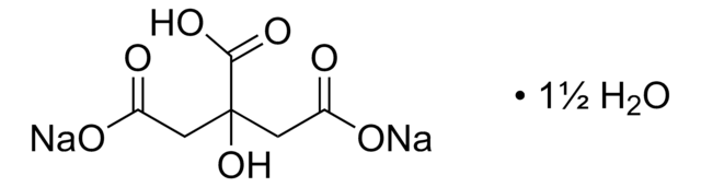 Sodium hydrogen citrate sesquihydrate is suitable reagent to investigate the mediatorless laccase cathodes as half-cell electrode under galvanostatic load by using a two-compartment set up. It may be used in the extraction of organ/tissue sample using QuEChERS (Quick, Easy, Cheap, Effective, Rugged, and Safe) extraction methods. It is suitable for use in the analysis of multiclass pesticides by multiresidue method based on the sample preparation by modified QuEChERS and detection by GC coupled to single quadruple mass spectrometery.