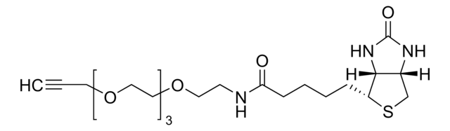 Biotinylation reagent for labeling azide containing molecules or biomolecules using copper-catalyzed 1,3 dipolar cycloaddition click chemistry. The alkyne group reacts with azides to form a stable triazole linkage, facilitating the introduction of biotin into your azide modified system of interest.