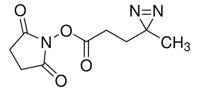 - Heterobifunctional—NHS ester group reacts with primary amines at pH 7 to 9 to form covalent amide bonds; diazirine (azipentanoate) group reacts efficiently with any amino acid side chain or peptide backbone upon activation with long-wave UV light (330-370 nm)