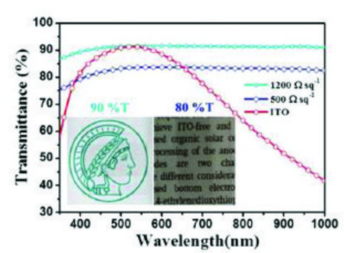 b) 20 nm film: 80% transmittance, 500 Ω/sq (as made).