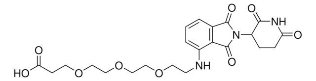 Protein degrader builiding block Pomalidomide-PEG3-CO2H enables the synthesis of molecules for targeted protein degradation and PROTAC (proteolysis-targeting chimeras) technology. This conjugate contains a Cereblon (CRBN)-recruiting ligand and a PEGylated crosslinker with pendant carboxylic acid for reactivity with an amine on the target ligand. Because even slight alterations in ligands and crosslinkers can affect ternary complex formation between the target, E3 ligase, and PROTAC, many analogs are prepared to screen for optimal target degradation. When used with other protein degrader building blocks with a pendant carboxyl group, parallel synthesis can be used to more quickly generate PROTAC libraries that feature variation in crosslinker length, composition, and E3 ligase ligand.