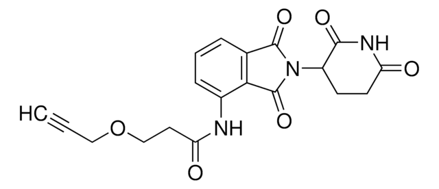 Protein degrader builiding block Pomalidomide-PEG1-Alkyne enables the synthesis of molecules for targeted protein degradation and PROTAC (proteolysis-targeting chimeras) technology. This conjugate contains a Cereblon (CRBN)-recruiting ligand and a PEGylated crosslinker with pendant alkyne for click chemistry with an azide on the target ligand. Because even slight alterations in ligands and crosslinkers can affect ternary complex formation between the target, E3 ligase, and PROTAC, many analogs are prepared to screen for optimal target degradation. When used with other protein degrader building blocks with a pendant alkyne group, parallel synthesis can be used to more quickly generate PROTAC libraries that feature variation in crosslinker length, composition, and E3 ligase ligand.