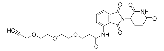 Protein degrader builiding block Pomalidomide-PEG3-Alkyne enables the synthesis of molecules for targeted protein degradation and PROTAC (proteolysis-targeting chimeras) technology. This conjugate contains a Cereblon (CRBN)-recruiting ligand and a PEGylated crosslinker with pendant alkyne for click chemistry with an azide on the target ligand. Because even slight alterations in ligands and crosslinkers can affect ternary complex formation between the target, E3 ligase, and PROTAC, many analogs are prepared to screen for optimal target degradation. When used with other protein degrader building blocks with a pendant alkyne group, parallel synthesis can be used to more quickly generate PROTAC libraries that feature variation in crosslinker length, composition, and E3 ligase ligand.