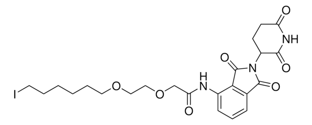 Protein degrader builiding block Pomalidomide-PEG2-butyl Iodide enables the synthesis of molecules for targeted protein degradation and PROTAC (proteolysis-targeting chimeras) technology. This conjugate contains a Cereblon (CRBN)-recruiting ligand, a linker with both hydrophobic and hydrophilic moieties, and a pendant iodoalkane for reactivity with a nucleophilic group on a target ligand. Because even slight alterations in ligands and crosslinkers can affect ternary complex formation between the target, E3 ligase, and PROTAC, many analogs are prepared to screen for optimal target degradation. When used with other protein degrader building blocks with a pendant iodo group, parallel synthesis can be used to more quickly generate PROTAC libraries that feature variation in crosslinker length, composition, and E3 ligase ligand.