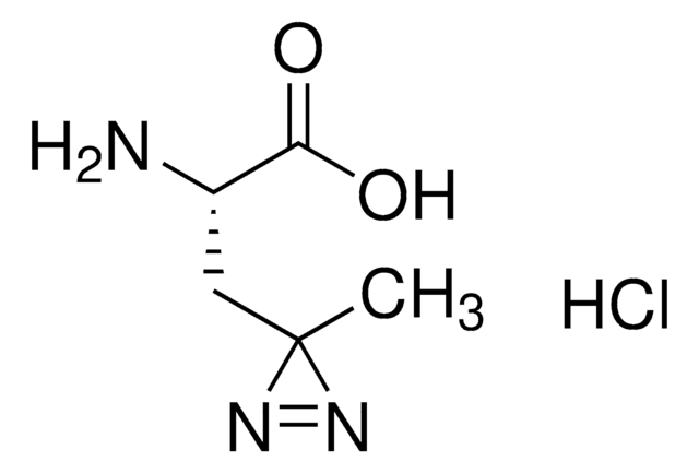 H-L-Photo-leucine HCl is a diazirine-containing leucine amino acid and multifunctional photo-crosslinker. Its incorporation into peptides or small-molecule probes and tools allows for photoaffinity labeling of cellular targets and protein-protein interactions upon UV light (∼360 nm) irradiation to form a covalent bond. This and other multifunctional probe building blocks will continue to accelerate drug discovery research for probing cellular mechanisms, target ID/validation, and understanding traditionally undruggable targets. An Fmoc-protected version is also available as 907391.