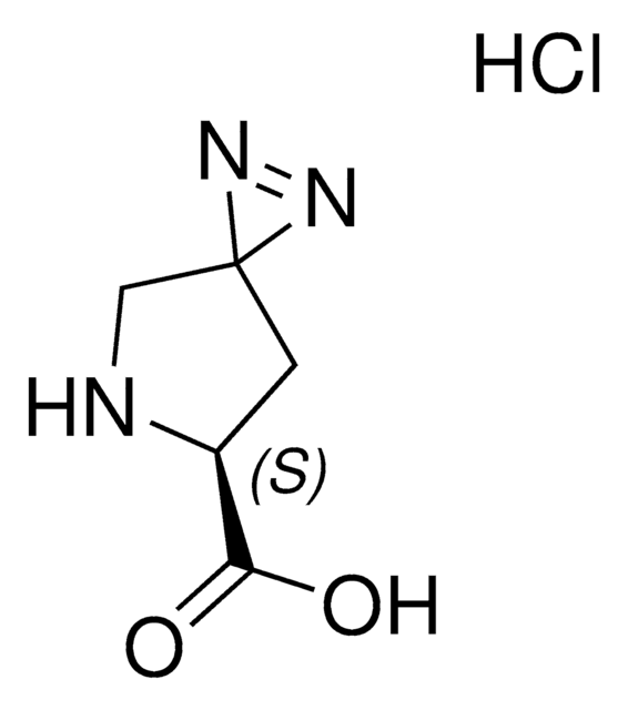 H-L-Photo-Proline HCl is a diazirine-containing proline amino acid and multifunctional probe building blocks. Its incorporation into peptides or small-molecule probes and tools allows for photoaffinity labeling of cellular targets and protein-protein interactions upon UV light (∼360 nm) irradiation to form a covalent bond. This and other multifunctional probe building blocks will continue to accelerate drug discovery research for probing cellular mechanisms, target ID/validation, and understanding traditionally undruggable targets. An Fmoc-protected version is also available as 907324.