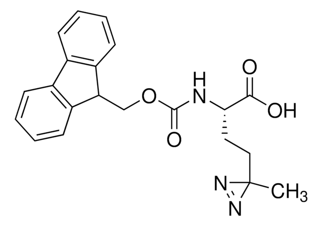 Fmoc-L-photo-methionine is a diazirine-containing, Fmoc-protected methionine amino acid and multifunctional photo-crosslinker. Its incorporation into peptides or small-molecule probes and tools allows for photoaffinity labeling of cellular targets and protein-protein interactions upon UV light (∼360 nm) irradiation to form a covalent bond. This and other multifunctional probe building blocks will continue to accelerate drug discovery research for probing cellular mechanisms, target ID/validation, and understanding traditionally undruggable targets. An unprotected version is also available as 907375.