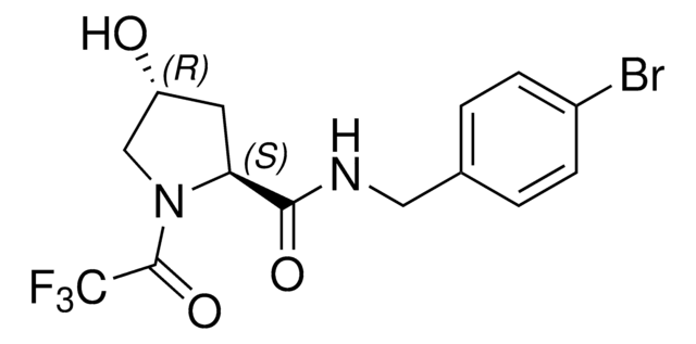 Fluorinated VHL Spy Molecule 2 can be used for the discovery of new von Hippel-Lindau (VHL) binders. Based on VH032 (cat# 901490), this reporter was designed in the lab of Alessio Ciulli to bind the hydroxyproline (Hyp) recognition site of VHL. When used in competition ligand-observed 19F NMR screening experiments, its displacement indicates binding by another molecule. Additional Fluorinated VHL Spy Molecules are available as listings 909459, 909440, and 909416.
