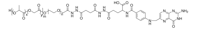Folate-poly(ethylene glycol)-b-poly(lactide-co-glycolide) is a functionalized, amphiphilic, diblock copolymer composed of a hydrophilic PEG block and a hydrophobic PLGA block. These biodegradable, biocompatible polymers can self-assemble to form nanoparticles, such as micelles and polymersomes, in both aqueous and non-aqueous media. Due to these properties, these polymers are widely used in polymeric nanoparticle formulation to achieve controlled and targeted delivery of therapeutic agents (e.g. APIs, genetic material, peptides, vaccines, and antibiotics). The folate functional group on the PEG chain enables rapid and facile surface functionalization, allowing for these materials to be used in applications such as targeted drug delivery.