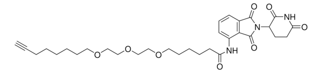 Protein degrader builiding block Pomalidomide-C6-PEG3-butyl alkyne enables the synthesis of molecules for targeted protein degradation and PROTAC (proteolysis-targeting chimeras) technology. This conjugate contains a Cereblon (CRBN)-recruiting ligand, a linker with both hydrophobic and hydrophilic moieties, and a pendant alkyne for click chemistry with an azide on the target ligand. Because even slight alterations in ligands and crosslinkers can affect ternary complex formation between the target, E3 ligase, and PROTAC, many analogs are prepared to screen for optimal target degradation. When used with other protein degrader building blocks with a pendant alkyne, parallel synthesis can be used to more quickly generate PROTAC libraries that feature variation in crosslinker length, composition, and E3 ligase ligand.