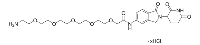 Protein degrader building block C5 Lenalidomide-PEG5-NH2 hydrochloride enables the synthesis of molecules for targeted protein degradation and PROTAC (proteolysis-targeting chimeras) technology. This conjugate contains a Cereblon (CRBN)-recruiting ligand with alternative exit vector and a PEGylated crosslinker with pendant amine for reactivity with an acid on the target warhead. Because even slight alterations in ligands, warheads, and crosslinkers can affect ternary complex formation between the target, E3 ligase, and PROTAC, many analogs are prepared to screen for optimal target degradation. When used with other protein degrader building blocks with a terminal amine, parallel synthesis can be used to more quickly generate PROTAC libraries that feature variation in crosslinker length, composition, and E3 ligase ligand.