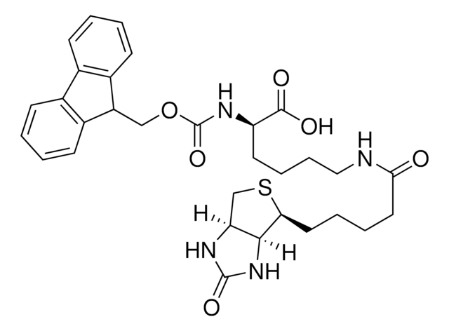 Fmoc-D-Lys(Biotin)-OH is a modified lysine derivative for the preparation of biotin-labeled peptides by Fmoc SPPS. Fmoc-L-Lys(Biotin)-OH is available as cat# 8.52097.