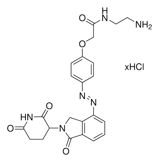 Protein degrader building block Lenalidomide-Photoswitch2-NH2 hydrochloride enables the synthesis of PHOtochemically TArgeting Chimeras (PHOTACs), or photoswitchable proteolysis-targeting chimeras (PROTACs) that can be reversibly activated with different wavelengths of light. Developed in the Trauner and Pagano labs, PHOTACs are inactive in the dark but are activated to the cis isomer via irradiation at 390 nm and reversibly deactivated at wavelengths above 450 nm. As described in Reynders et al, this conjugate was used to prepare PHOTAC-II-5 and contains a Cereblon (CRBN)-recruiting ligand, an azobenzene photoswitchable crosslinker, and pendant amine for reactivity with an acid on the target warhead. Light-mediated control of the resulting PHOTAC affords advanced temporal and spatial control of targeted protein degradation.