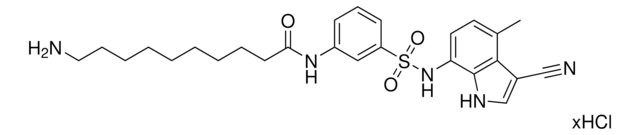 Protein degrader building block E7820-C9-NH2 hydrochloride enables the synthesis of molecules for targeted protein degradation and PROTAC® (proteolysis-targeting chimeras) research. This conjugate contains a DCAF15-recruiting ligand E7820 (SML2950), an alkyl linker, and a pendant amine for reactivity with a carboxylic acid on the target ligand. Because even slight alterations in ligands and crosslinkers can affect ternary complex formation between the target, E3 ligase, and degrader, many analogs are prepared to screen for optimal target degradation. When used with other protein degrader building blocks with a terminal amine, parallel synthesis can be used to more quickly generate degrader libraries that feature variation in crosslinker length, composition, and E3 ligase ligand.