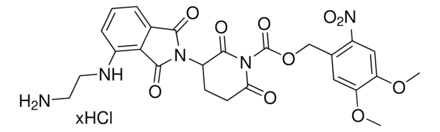 Protein degrader building block Opto-pomalidomide-C2-NH2 hydrochloride enables the synthesis of molecules for light-induced targeted protein degradation and PROTAC® (proteolysis-targeting chimeras) research. This conjugate contains a Cereblon (CRBN) recruiting ligand, a rigid linker, and a pendant amine for reactivity with a carboxylic acid on the target ligand. Because even slight alterations in ligands and crosslinkers can affect ternary complex formation between the target, E3 ligase, and degrader, many analogs are prepared to screen for optimal target degradation. When used with other protein degrader building blocks with a terminal amine, parallel synthesis can be used to more quickly generate degrader libraries that feature variation in crosslinker length, composition, and E3 ligase ligand.
