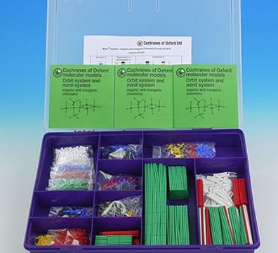 An extensive model system offering 15 atomic bonding configurations in 12 colors of plastic atoms. The carbon atom is represented in nine configurations: linear, trigonal (in five angle variations), tetrahedral, octahedral, trigonal-bipyramidal. Models come in two sizes: Orbit and Minit. Spare atom centers and bonding tubes are available for all model kits.