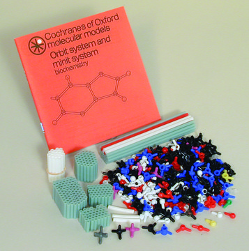 An extensive model system offering 15 atomic bonding configurations in 12 colors of plastic atoms. The carbon atom is represented in nine configurations: linear, trigonal (in five angle variations), tetrahedral, octahedral, trigonal-bipyramidal. Models come in two sizes: Orbit and Minit. Spare atom centers and bonding tubes are available for all model kits.