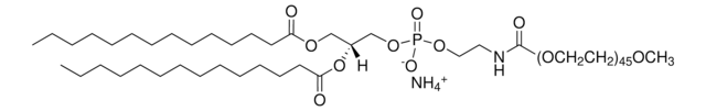 14:0 PEG2000 PE or 1,2-dimyristoyl-sn-glycero-3-phosphoethanolamine-N-[methoxy(polyethylene glycol)-2000] has been used in: giant vesicles preparation, lipid nanoparticle (LNP) formulation, unilamellar liposomes preparation for small-angle X-ray scattering (SAXS) experiments