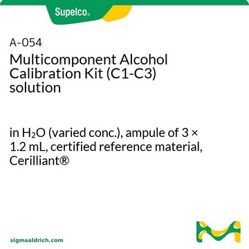 Multicomponent Alcohol Calibration Kit (C1-C3) solution is a certified reference material, suitable for calibration.