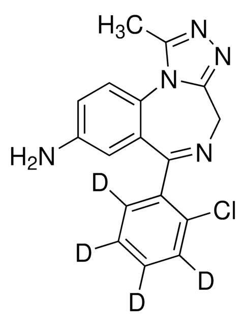 This stable-labeled internal standard is suitable for quantification of 8-aminoclonazolam by LC/MS or GC/MS for clinical toxicology, forensic analysis, or urine drug testing applications. 8-Aminoclonazolam is a benzodiazepine metabolite of clonazolam.