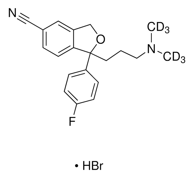 Citalopram is an antidepressant sold under the trade names Celexa® and Cipramil for the treatment of major depression. Citalopram is a selective serotonin reuptake inhibitor, a class of drugs that also includes fluoxetine, paroxetine, and sertraline. This internal standard is suitable for quantitation of citalopram levels in urine, serum, or plasma by LC/MS or GC/MS for urine drug testing, clinical toxicology, forensic analysis, or isotope dilution methods.