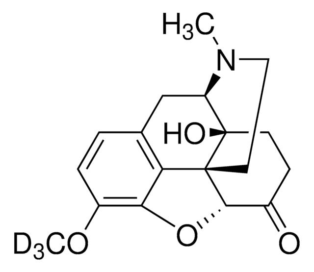 This internal standard is suited for quantification of oxycodone levels in urine, serum, or plasma by LC/MS or GC/MS for urine drug testing, clinical toxicology, forensic analysis, or isotope dilution methods. Oxycodone is a semi-synthetic opioid analgesic sold under many trade names including OxyContin® and Percocet® for treatment of moderate to severe pain. Oxycodone is also sold illicitly under street names such as "Roxies," "Blues," and "Perks".