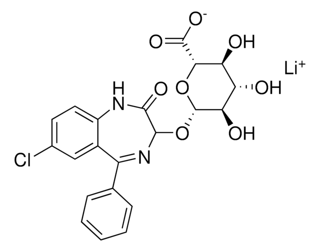 Oxazepam glucuronide is a major urinary metabolite of the benzodiazepine drug, oxazepam. Oxazepam, marketed as Alepam, Medopam, or Murelax, has been used extensively since the 1960s for treatment of anxiety and insomnia and in the control of symptoms of alcohol withdrawal. This certified reference solution is suitable for GC/MS or LC/MS applications with oxazepam or oxazepam glucuronide such as urine drug testing, pain prescription monitoring, toxicology analysis, or forensic testing.