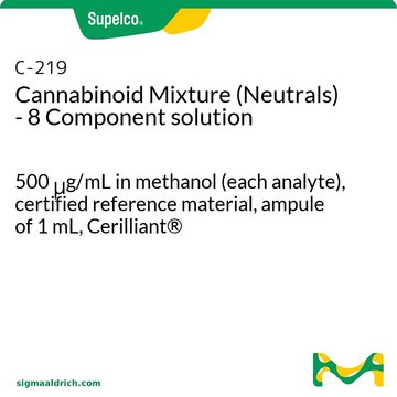 Cannabidiol, 500 μg/mL , Cannabigerol (CBG), 500 μg/mL , Cannabinol, 500 μg/mL , CBC (Cannabichromene), 500 μg/mL , CBDV (Cannabidivarin), 500 μg/mL , (-)-delta8-THC, 500 μg/mL , (-)-delta9-THC, 500 μg/mL , THCV, 500 μg/mL