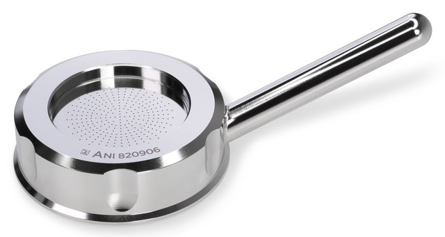 The Perforated lid stainless steel, 300 x 0.6 mm holes with edge protection and handle can be used with the MAS-100 ISO NT® and MAS-100 ISO MH® microbial air samplers. For safe and easy handling in isolators with gloves it is provided with a handle. The sieve of the perforated lid is at the core of the viable air sampler. Each hole must have an identical diameter and length to accelerate the aspirated air correctly. The 3mm thickness of the perforated sieve guarantee a well-defined impaction jet. The impaction speed defines the physical sampling efficiency. The cut-off value d50 (the particle size at which 50% of the particles impact in the agar due to inertia and 50% are exhausted with the airstream) must be identical between holes and between lids. That is why intense quality control of the sieves is performed. The sieve pattern with 300 holes of a diameter of 0.6 mm provides an impaction speed of approximately 20 m/s at a flow rate of 100 l/min. This impaction speed allows a high physical efficiency, meaning a sampling efficiency of more the 50% of small particles at a size of less than 1.1 μm (d50, calculated, below 0.8 μm in validation studies) while maintaining the viability of microorganisms during impaction on the agar surface (biological efficiency). The validation of physical and biological efficiency has been independently performed for each individual MAS Air sampler model. The perforated lid can be autoclaved and disinfected with all disinfectants compatible stainless steel in order to avoid false positive results in high grade cleanrooms. The sampling efficiency for an instrument must remain identical, irrespective of the lid used. Our perforated lids allow the exchange of several lids with identical sieve pattern on the MAS air sampler without the need of re-calibration.