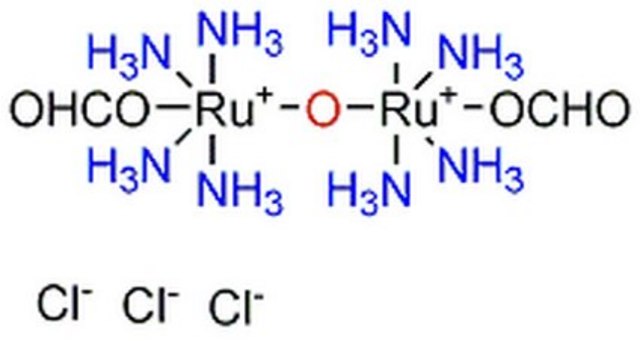 A cell-permeable oxygen-bridged dinuclear ruthenium amine complex that has been shown to bind to mitochondria with high affinity (Kd = 340 pM). Specifically blocks Ca2+ uptake into mitochondria in vitro (IC50 = 184 pM) and in situ in intact myocytes (complete block after incubation with ~10 µM of Ru360 for 30 min). Does not affect other cellular Ca2+ transport processes involved in cardiac muscle contraction, even at micromolar levels.