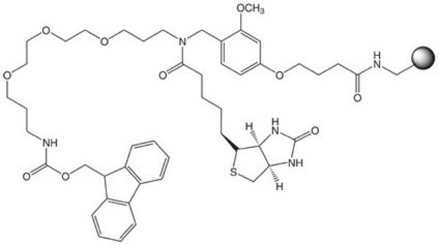 Fmoc-PEG Biotin NovaTag resin offers all the benefits as biotin-PEG NovaTag resin (855055) in the synthesis of biotinylated peptides, with the additional advantage that the C-terminal amino acid can be coupled to this resin using any coupling methods.