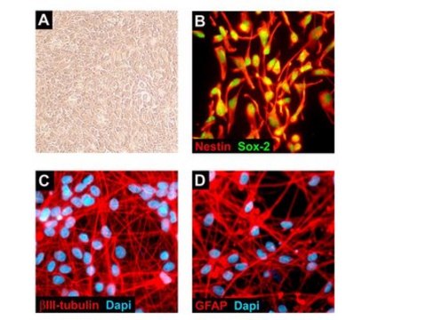 Each lot of ReNcell VM cells has been validated for high level of expression of Nestin and Sox 2 and for their self-renewal and multi-lineage differentiation capacities. Cells also display normal karyotype as assessed by chromosome spread and tested negative for mycoplasma. Maternal blood has been screened for HIV, HTLV, Hepatitis B and C.