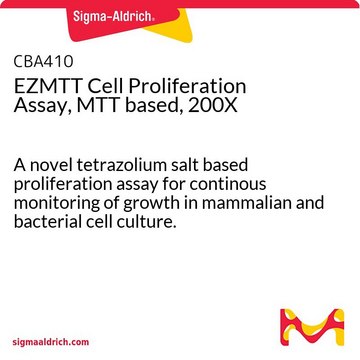 EZMTT is a novel monosulfonated tetrazolium salt, 2-(3-(2-methoxy-4-nitrophenyl)-2-(4-nitrophenyl)-2H-tetrazol-3-ium-5-yl) benzenesulfonate sodium salt (EZMTT). The EZMTT reagents provided high quality and reproducible detection for oxidoreductase enzymes, indicators of cellular metabolic activity. Upon reacting with metabolic enzymes, EZMTT is converted to a yellowish formazan that does not require a solubilization step and can be measured by absorbance at 450 nm. EZMTT assay can continuously track cell proliferation and measure cytotoxicity (loss of viable cells) or cytostatic activity (shift from proliferation to quiescence) of potential medicinal or toxic agents.