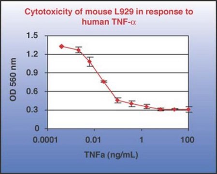Specific Activity: Chemicon′s human TNF-alpha, is fully biologically active when compared to standards.The ED50 as determined by the cytolysis of mouse L929 cells in the presence of Actinomycin-D is ≤ 0.05 ng/mL