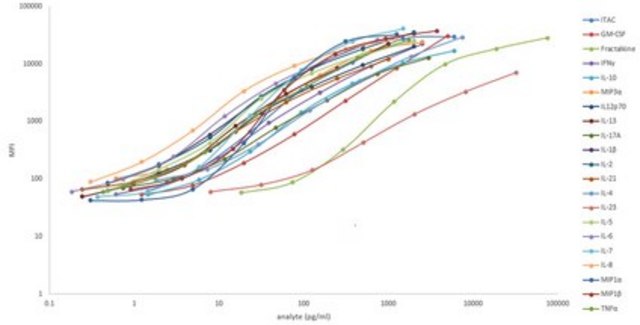 Analytes included: Fractalkine/CX3CL1, GM-CSF, IFN-gamma, IL-1beta, IL-2, IL-4, IL-5, IL-6, IL-7, IL8/CXCL8, IL-10, IL-12 (p70), IL-13, IL17A/CTLA8, IL-21, IL-23, ITAC/EXCL11, MIP-1α/CCL3, MIP-1β/CCL4, MIP-3α/CCL20 and TNFα