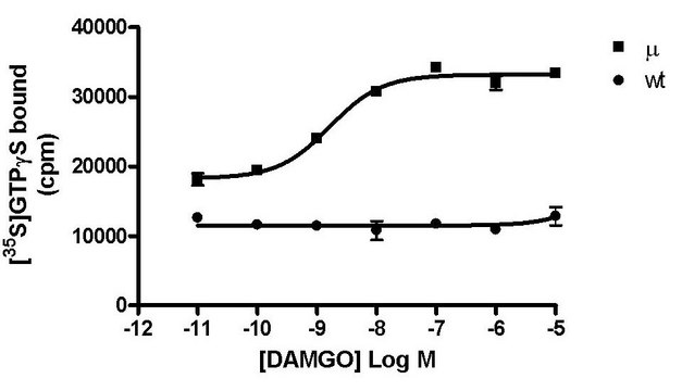 ASSAY CONDITIONS: Membranes are permeabilized by addition of saponin to an equal concentration by mass, then mixed with [35S]-GTPγS (final concentration of 0.3 nM) in 20 mM HEPES, pH 7.4/100 mM NaCl/10 mM MgCl2/0.5 μM GDP in a nonbinding 96-well plate. Unlabeled DAMGO added to the final concentration indicated in Figure 1 (final volume 100 μL), and incubated for 30 min at 30°C. The binding reaction is transferred to an FB filter plate (Millipore MAHF B1H) previously prewetted with water, and washed 3 times (1 mL per well per wash) with cold 10 mM sodium phosphate, pH 7.4. The plate is dried and counted.