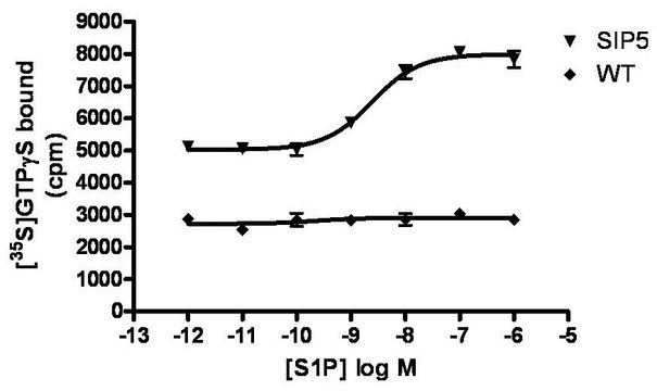 S1P5 can couple with Gi/o and G12/13, and it mediates S1P induced adenylate cyclase inhibition and Ca2+ mobilization like the other S1P receptors. However, unlike the other S1P receptors, it mediates inhibition of MAPK activation and cell proliferation (Im et al., 2000). S1P5 is predominantly expressed in the white matter tracts and oligodendrocytes and is particularly abundant in the anterior commissure, corpus collosum, and optic tract (Terai et al., 2003). S1P induces process retraction in pre-oligodendrocytes and supports cell survival in mature oligodendrocytes by activating S1P5, which indicates a role for S1P5 in maturation and myelination of oligodendrocytes (Jaillard et al., 2005). Millipore′s S1P5 membrane preparations are crude membrane preparations made from our proprietary stable recombinant cell lines to ensure high-level of GPCR surface expression; thus, they are ideal HTS tools for screening of S1P5 interactions with its ligands. The membrane preparations exhibit EC50s of 2.4 nM for S1P in a GTPγS binding assay.
