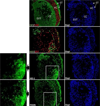 In Immunoprecipitation and Western blot experiments the Ki-S5 antibody recognizes a cell-cycle-associated protein of 345 kD and 395 kD (Kreipe et al., 1993) identical with the Ki-67 antigen. The antibody binds to a formalin-resistant epitope of the Ki-67 antigen. The immunoreactivity of Ki-S5 is confined to the nuclei of proliferating cells and no crossreactivity with cytoplasmic antigens of epithelial occurs even after antigen retrieval (Mauri et al., 1984). A comparison of immunohistochemical labeling of fresh and fixed tissue samples of NHL showed that identical results were obtained with Ki-67 and Ki-S5 (Kreipe et al., 1993). The Ki-67 antigen is preferentially expressed during late G1, S, G2 and M phase of the cell cycle, while resting, non-cycling cells (G0 phase) lack the Ki-67 antigen. In addition, constantly proliferating cells (e.g. cell lines) react positively to Ki-S5 during the entire cell-cycle. This specificity of Ki-S5 antibody for proliferating cells might make it a useful tool for determination of the proliferative fraction in tumors such as Non-Hodgkin′s lymphoma (Kreipe et al., 1993), mammary carcinomas (Mauri et al., 1984), ovarian tumors (Ballin et al., 1994) and prostate cancer.