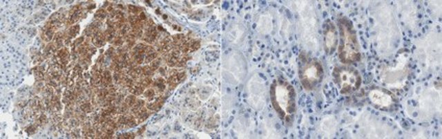 Immunohistochemistry Analysis: A 1:50 dilution from a representative lot detected potassium channel Kir3.4 in human adrenal gland and kidney tissue sections.