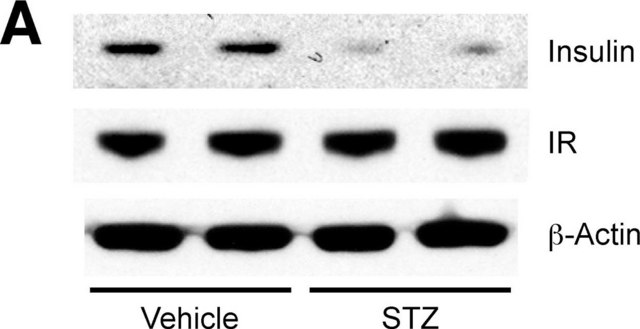 The insulin receptor is a tyrosine kinase receptor that when bound to insulin, initiates multiple signal transduction pathways, including JNK, PI 3-kinase, Akt and PKC. Pharmacological intervention of these Insulin R-dependent pathways is of great interest for the treatment of insulin resistance, obesity and diabetes. The Insulin Receptor (IR) is synthesized as a single polypeptide, which is subsequently cleaved to generate an extracellular α-chain and a transmembrane and intracellular β-chain, tethered together by disulfide bonds. The β-chain has multiple tyrosine phosphorylation sites, including three autophosphorylation sites at its activation loop. The overall structure of the IR is highly homologous to the IGF-I Receptor, except in their c-termini, where the two proteins diverge somewhat. The IR signals primarily by phosphorylating the Insulin Receptor Substrate (IRS) family of proteins, which creates docking sites for SH2-domain containing proteins. Insulin signaling is highly dependent on the PI3 Kinase pathway and Akt, which appear to mediate the functions of insulin.