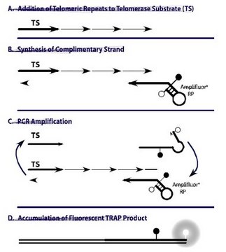 The TRAPeze™ RT Telomerase Detection Kit is a highly sensitive in vitro assay for the fluorometric detection and real time quantification of telomerase activity. It incorporates refinements to the original TRAP assay that were first introduced in the gel-based TRAPeze™ Telomerase Detection Kit (Cat. No. S7700) and adds the ability to quantitate telomerase activity using fluorescence energy transfer (ET) primers similar to the TRAPeze™ XL Telomerase Detection Kit (Cat. No. S7707). As in the original TRAPeze™ Kit, primer sequence modifications that reduce amplification artifacts and PCR controls for standard curve generation are included. In addition, both the TRAPeze™ RT and XL Kits use fluorescence energy transfer (ET) primers to generate fluorescently labeled TRAP products which permit nonisotopic, quantitative analysis of telomerase activity.