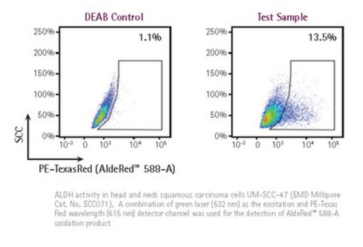 High ALDH activity serves as a universal marker of stem cells, both normal and malignant. Cells can be identified and isolated based upon the enzymatic activity of ALDH, a detoxifying enzyme responsible for oxidation of hazardous aldehyde byproducts. The marker ALDH has been used to isolate cancer stem cells from various human malignancies including bladder, breast, cervical, colon, head and neck, liver, lung, pancreas, prostate and ovary. The AldeRed assay employs a fluorescent and non-toxic ALDH substrate (AldeRed 588-A) that diffuses freely into intact and viable cells, but remains trapped inside the cells once converted by ALDH into the corresponding acid. The amount of fluorescence produced is proportional to the ALDH activity in the cells and is measured by flow cytometry, allowing fluorescence-activated cell sorting (FACS). This kit supplies the ALDH inhibitor diethylaminobenzaldehyde (DEAB), which is used in negative control testing necessary for background fluorescence assessement.
