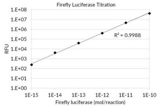 Firefly luciferase is widely used as a reporter for studying gene regulation and function, and for pharmaceutical screening. It is a very sensitive genetic reporter due to the absence of endogenous luciferase activity in mammalian cells or tissues. Firefly luciferase is a 62,000 Dalton protein, which is active as a monomer and does not require subsequent processing for its activity. The enzyme catalyzes ATP-dependent D-luciferin oxidation to oxyluciferin, producing light emission centered at 560 nm. Light emitted from the reaction is directly proportional to the number of luciferase enzyme molecules.