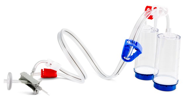 Blue base canister with a vented double needle for small vials with septa.