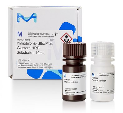 Immobilon® ECL UltraPlus delivers maximum sensitivity for Western blot immunodetection, and is ideal for detection of low-abundance targets. It is a non-isotopic, luminol-based chemiluminescence substrate for Horseradish Peroxidase (HRP), designed for the chemiluminescent detection of immobilized proteins conjugated with horseradish peroxidase (HRP). It is compatible with both PVDF and nitrocellulose blotting membranes, as well as commonly used buffers and blocking reagents.