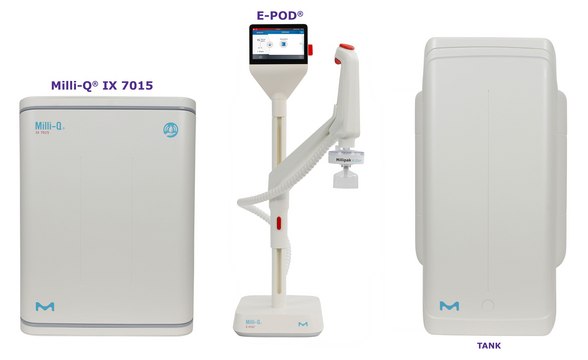 - This catalog number does not include consumables, accessories and other products and/or services that may be required for the installation and the correct operation of the water purification unit over time. A Milli-Q® IQ/IX storage tank 25 L, 50 L or 100 L and any additional E-POD® remote dispenser needs to be ordered in addition to this catalog number.