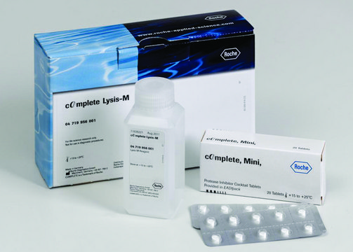 The ready-to-use cOmplete™ Mini Protease Inhibitor Cocktail Tablets, included in the kit, function optimally with the kit′s Lysis-M reagent. The cOmplete™ Mini Protease Inhibitor Tablets allow the inhibition of a broad spectrum of serine, cysteine, and metalloproteases, as well as calpains. cOmplete™ Lysis-M reagent helps in protein extraction and simultaneously inhibit protease activity during the initial extraction steps. cOmplete™ Mini Protease Inhibitor Tablets contain both irreversible and reversible protease inhibitors.